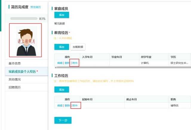 点击“保存并进行下一步”,继续填写家庭成员及个人经历并上传附件(如上传错误,可以删除重新上传,附件不能预览和下载)。