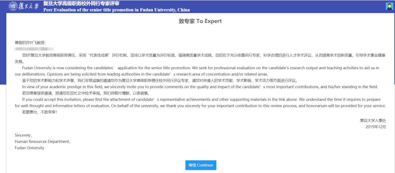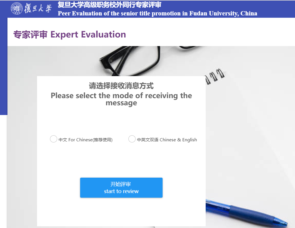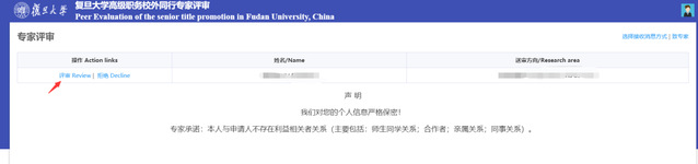1、收到评审邀请邮件后,通过浏览器(支持IE11及以上,Chrome浏览器和Safari浏览器)访问邮件中的网址,即可访问复旦大学高级职务校外同行专家评审系统进行评审。