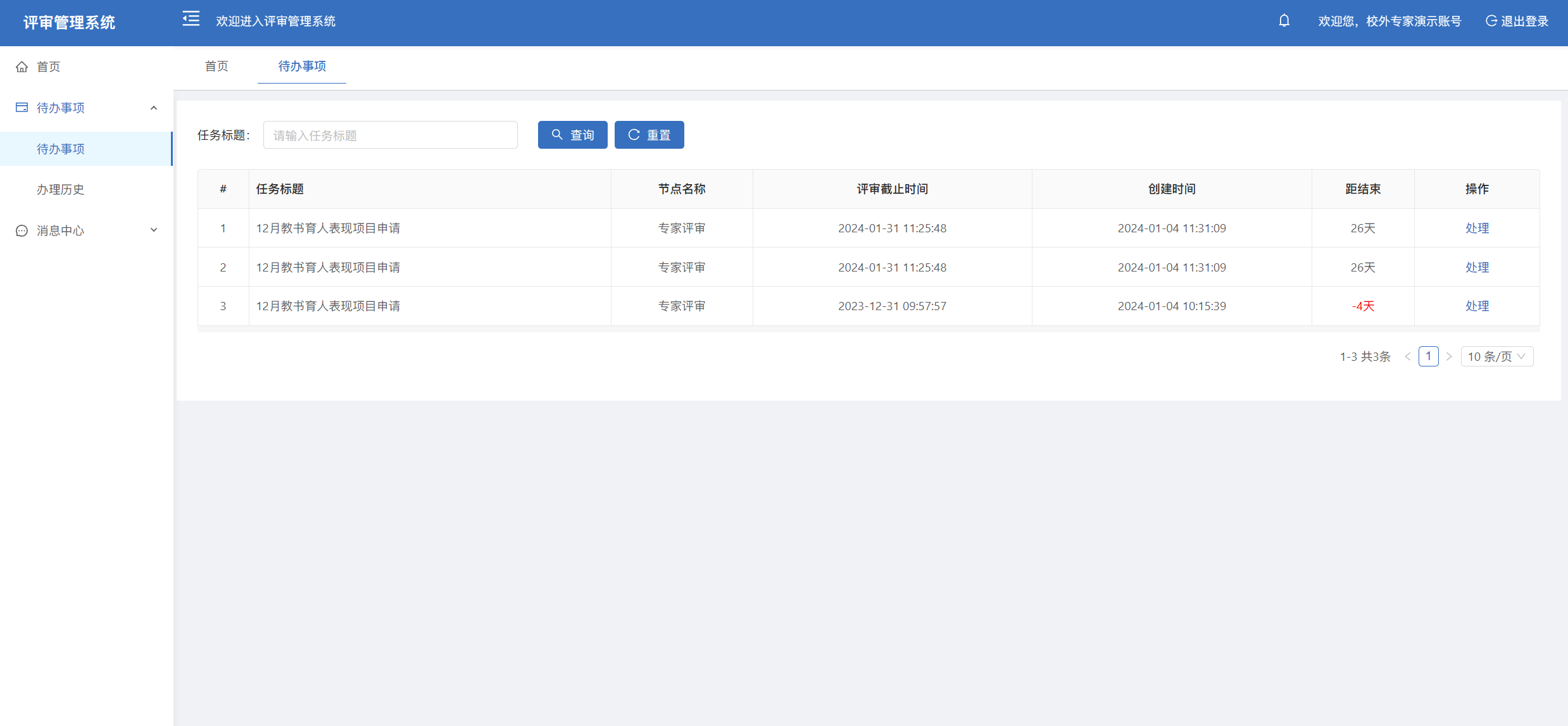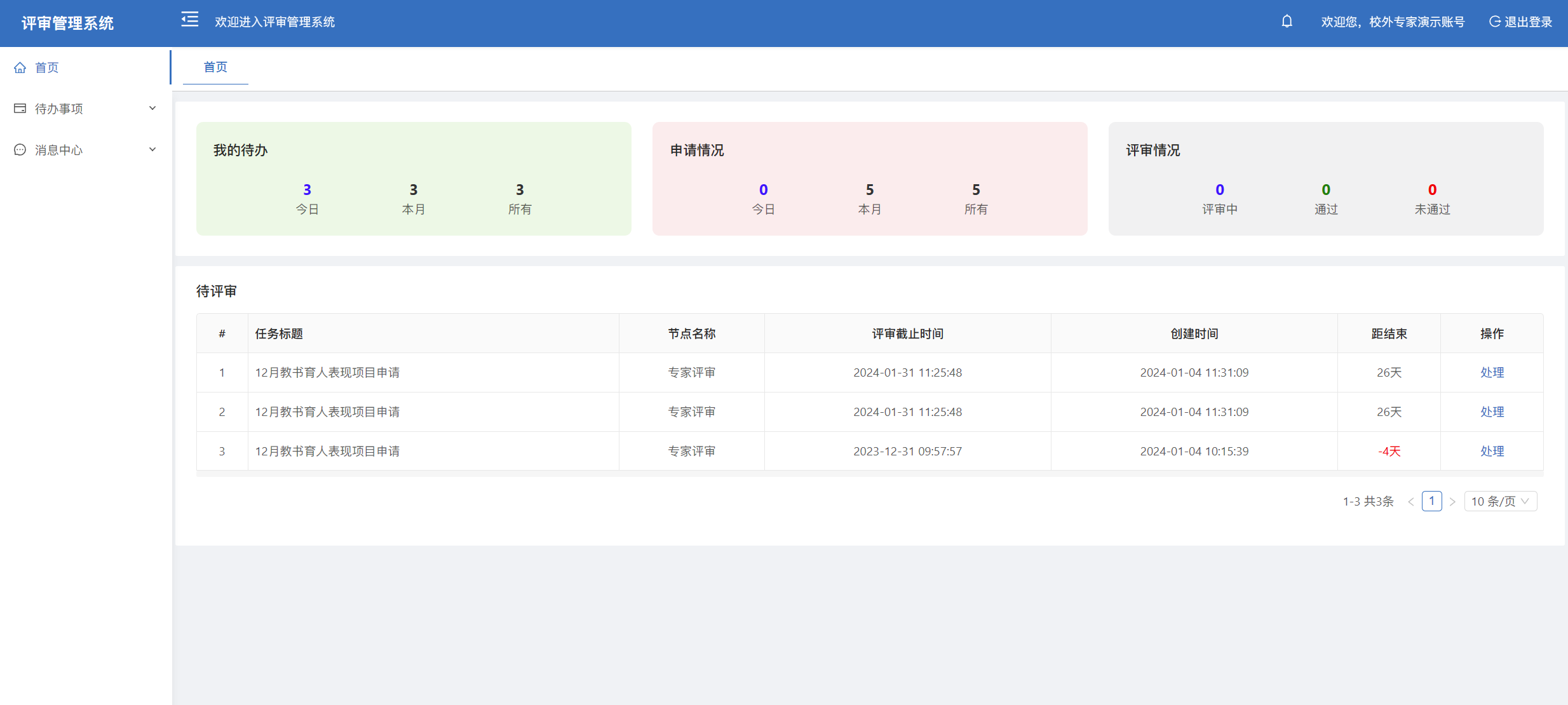 3.专家登录成功后进入首页界面,首页展示了我的待办、申请情况、评审情况和待评审列表,在待评审列表或者待办事项列表点击【处理】按钮进行评审。