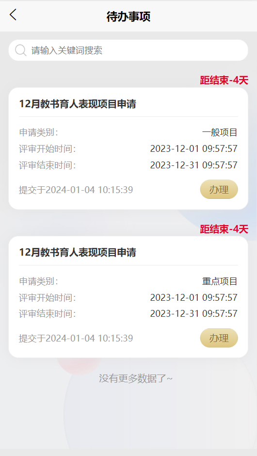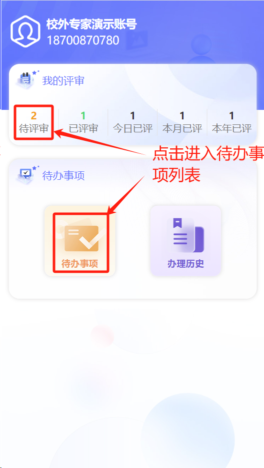 3.专家登录成功后进入首页界面,首页展示了我的评审、待办事项和办理历史,点击【待评审】或者【待办事项】进入待办事项列表。