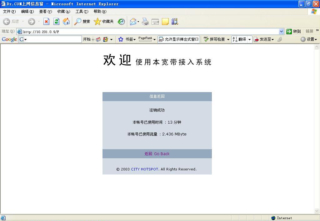 4. 点击“注销”后,将告知已使用时间和使用流量(如下图),若您不小心关闭了注销窗口或由于使用了禁止弹出窗口的浏览器外挂软件,可直接访问10.6.0.240进行注销。如果用户没有访问动作,在30分钟后也会自动注销。