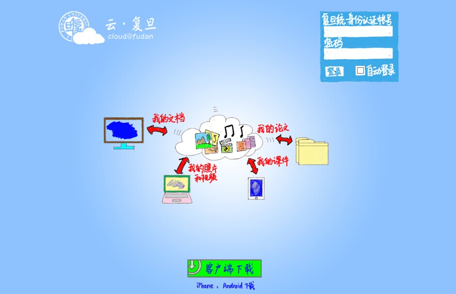 “云·复旦”是复旦大学信息办为广大师生打造的多终端云存储平台,集成统一身份认证(UIS),为每位在校师生提供50GB的云存储空间,支持校外访问,目前已正式对外提供服务。“云·复旦”向师生们提供安全高效的个人数据和教学科研数据存储分享服务,提供文件管理及备份、文件共享与资源群组,用户可将相同文件即时自动同步至PC、移动设备和Web,并分享给其他人。使用IOS操作系统的用户请在App Store中搜索“云复旦”下载安装应用,其余用户可以通过Web浏览器访问http://cloud.fudan.edu.cn下载“云·复旦”客户端。使用中如有问题,请发邮件至cloud@fudan.edu.cn