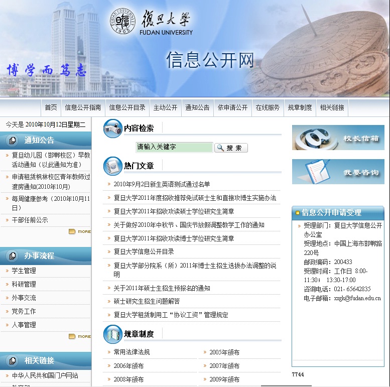 经过信息办与校办几个月来的共同努力,复旦大学信息公开网(http://xxgk.fudan.edu.cn)近日正式上线。信息公开网上除了发布了大量的学校规章制度、法律法规外,还提供了校长信箱和在线咨询功能,为校内外用户答疑解困。