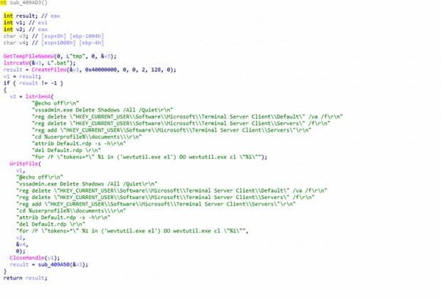 在勒索病毒完成加密动作后,其会在可执行批处理文件中调用“ vssadmin.exe Delete Shadows / All / Quiet”以删除所有卷影副本。在该批处理文件中,其还会清除保存在系统注册表中的远程桌面信息以及文件%UserProfile%\ Documents \ Default.rdp。其目的是防止受害者从卷影副本还原文件。