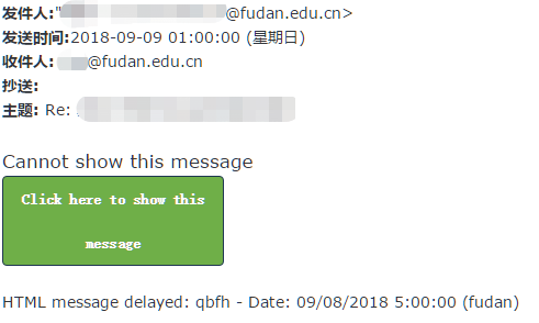 该电子邮件正文包含文本“Unable to/Cannot show/display this message(本消息无法显示卡)”,后面是一个按钮,包含“Click here to show/view message(点击此处查看消息)”的指令,如果点击了该链接,用户将被带到一个网站,该网站尝试诱导用户输入密码,并加载恶意脚本。如果脚本成功加载,它将向此用户自己的联系人发送更多相同类型的电子邮件。该电子邮件结束语有多种形式,说明消息被“延迟”,随后是随机代码和日期: