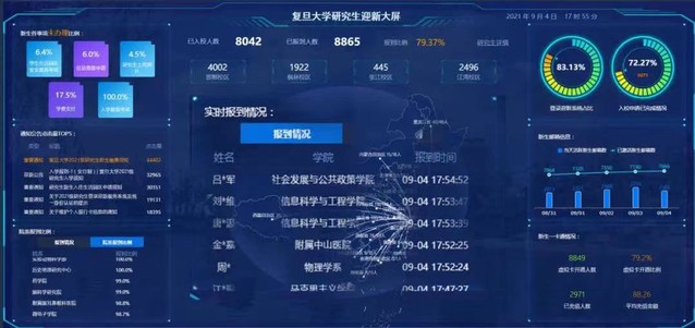为了更加清晰地展现迎新数据,方便学校和业务部门掌握迎新动态情况。信息办制作了驾驶舱迎新大屏,在9月4日-9月5日期间,大屏动态展示了2021级本科及研究生新生的报到及入校情况,展示内容包括:迎新事项办理、通知公告阅读量、实时报到和入校情况、一卡通、邮箱、登录系统及入校权限申请等信息,获得了业务部门的一致认可。
