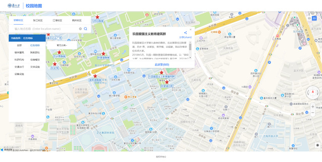 为传承复旦红色基因,赓续百年红色血脉,大力提升校内红色地标育人功能,信息办在校园电子地图(map.fudan.edu.cn)中标注出各校区红色地标,新生们可以根据校内红色地标位置追寻复旦校园内的红色足迹。