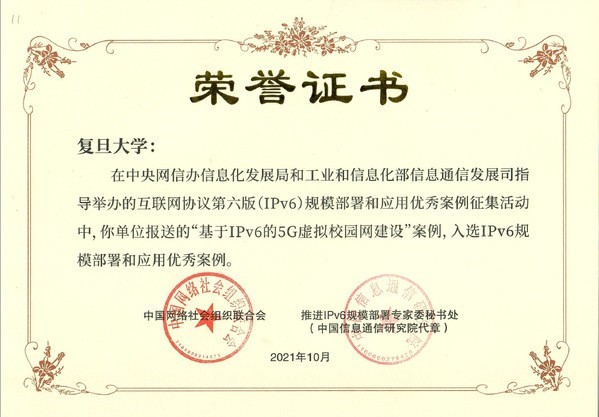 复旦大学“基于IPv6的5G虚拟校园网建设”项目成功入选由中央网信办信息化发展局和工业和信息化部信息通信发展司指导举办的互联网协议第六版(IPv6)规模部署和应用优秀案例。