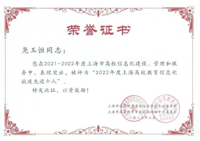 经专家评审,星空游戏app安卓尧玉恒同志被评选为“2022年度上海高校教育信息化抗疫先进个人”。