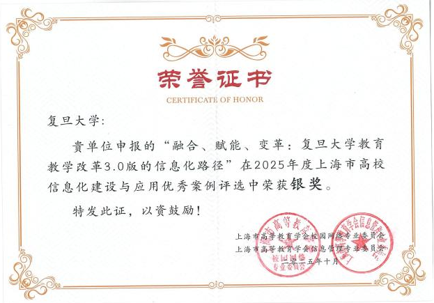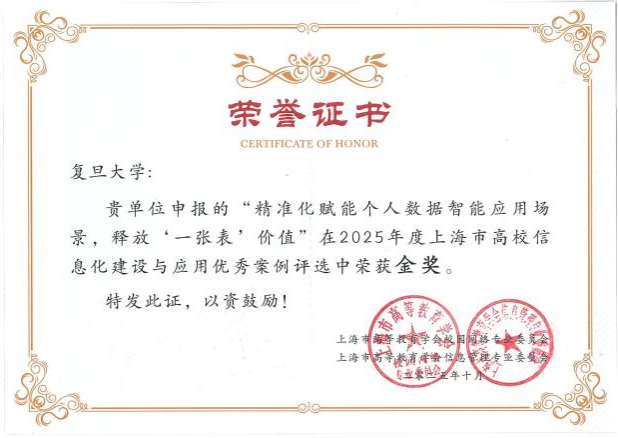 经专家评审,星空游戏app安卓申报的案例“精准化赋能个人数据智能应用场景,释放‘一张表’价值”和“融合、赋能、变革:复旦大学教育教学改革3.0版的信息化路径”分别荣获上海市高校信息化建设与应用优秀案例金奖和银奖。