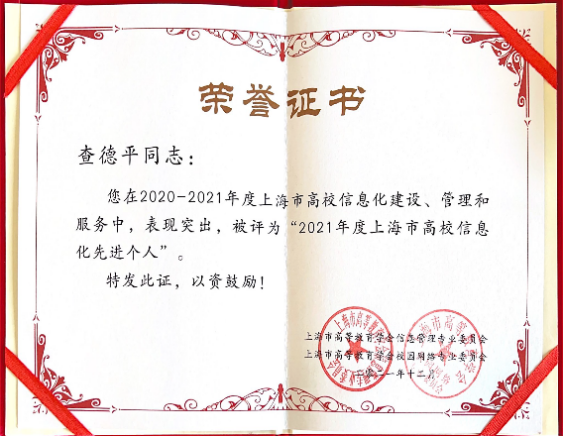 经专家评审,星空游戏app安卓查德平同志被评选为“2021 年度上海市高校信息化工作先进个人”。高校信息化工作是智慧高校建设道路上的重要环节,而树立模范人物,进行榜样引领也将鼓励高校信息化工作者们不畏挑战,迎难而上,披荆斩棘,不断创新,创造出更多的信息化校园的优秀方案。