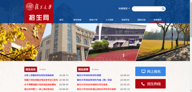 复旦大学招生网及招生管理系统是综合本专科生招生信息发布和自主招生管理的网络平台,于2005年底正式运行,2010年整体升级。该系统整合全校资源为全国英才报考复旦大学提供大量的招生信息和完善的网上招生服务,包括为高考考生提供信息查阅、考前在线咨询、报名号查询;为已被复旦录取的考生提供入校报到指南;为优秀高中毕业生、保送生、艺术特长生、体育特长生等自主招生提供网上报名、网上付费、准考证打印、成绩发布以及系统管理功能等。