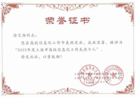 经专家评审,复旦大学沈沉和徐艺扬两位同志被评选为“2023年度上海市高校信息化工作先进个人”。