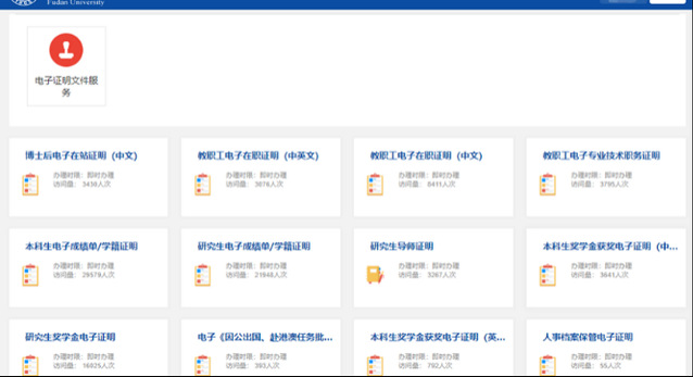 复旦大学电子签章平台于2021年上线,并陆续上线了本科生成绩单、本科生学籍证明、本科生奖学金证明、研究生成绩单、研究生学籍证明、研究生奖学金证明、教职工在职证明、博士后在站证明、研究生导师证明等共18项电子证明服务。电子签章平台提供标准的API接口,通过与复旦一站式平台对接,实现师生电子证明一键申领。