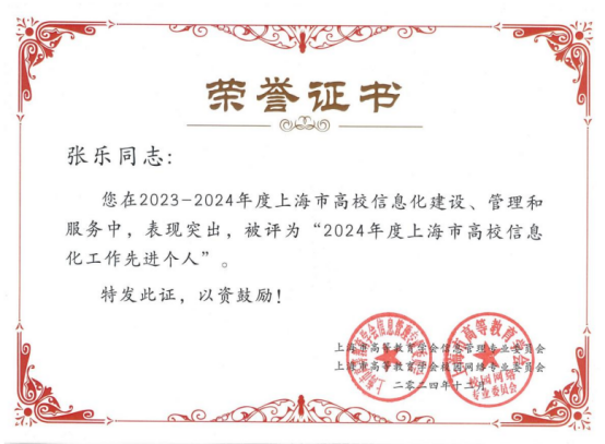 信息办2名同志获评“2024年度上海市高校信息化工作先进个人”