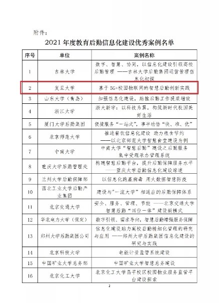 日前,中国教育后勤协会公布了“2021年教育后勤信息化建设优秀案例”获奖名单。其中,复旦大学“基于5G+校园物联网的智慧后勤创新实践”入选。