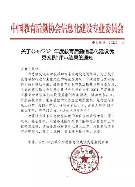 据悉,为总结交流学校后勤信息化建设先进经验,充分展示教育后勤行业信息化建设的特色及成果,有效发挥优秀示范的引领和带动作用,推进教育行业智慧后勤建设高质量发展,中国教育后勤协会信息化建设专业委员会于2021年开展了教育后勤信息化建设优秀案例征集活动。去年底,众多单位竞相申报参与角逐。经行业专家线上评审与研究后,推选出了45个优秀案例,并作为先进经验向全国各地区推广。